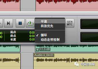 如图15-1所示,走带控制按钮除了悬浮在软件界面上的控制条之外,在软件顶栏的界面上也有。这些按钮各种录音软件都是一个模样,诸如播放、录音、快进快退等按钮,就不必多说了。需要注意的是,ProTools的播放键和录音键都有右键菜单,可以选择不同的模式,如图15-2、15-3所示。播放键选择循环之后,选中一段音频就可以循环播放。录音键最常用的是“快速插录”,选中后录音键上有一个P字。