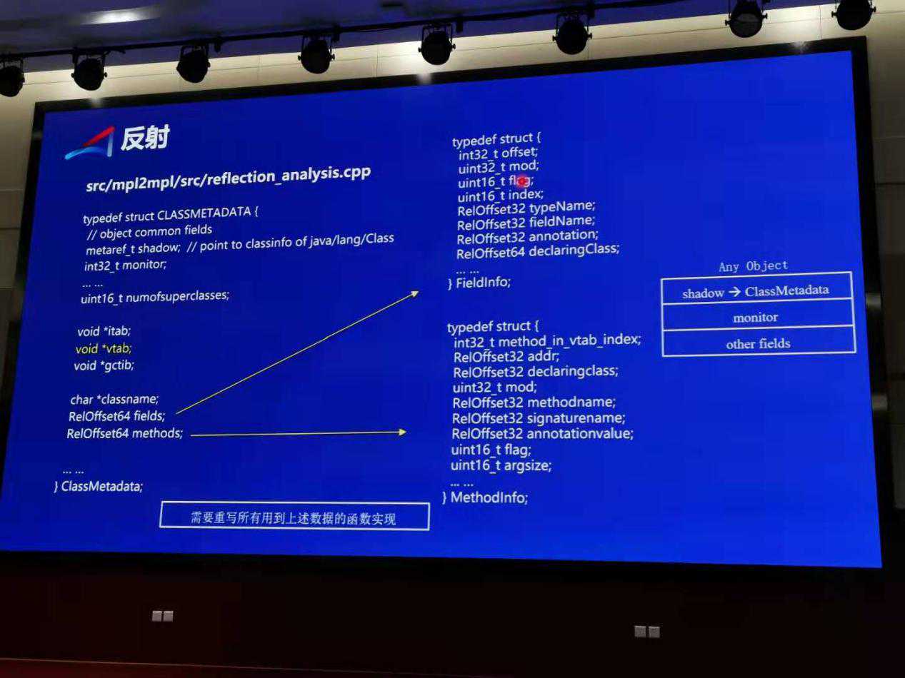 前面我们提到过JAVA的一个重要特性——反射,方舟编译器反射的内部表示的数据结构和art内部实现是完全不一样的,是华为自己定义出来的,主要是基于一些性能开销的考虑。在ClASSMETADATA中前面相当于是一个object的头,然后是shadow和monitor还有一些itab、vtba、gctib等。这个class里面有自己的field和Method,它现在的定义就是一个数组,Class这边是一个object,目前保存的其实不是一个object,在运行的时候,这部分会自己malloc出来一个object,然后会把这部分数据拷过去,这样就符合Java的语义了。我们定义完之后,需要重新实现重写所有用到上述数据的函数实现,需要付出另外一个代价,重写上面所有的Java函数,保持Java的接口不变,但是里面的实现是完全不能重用的。