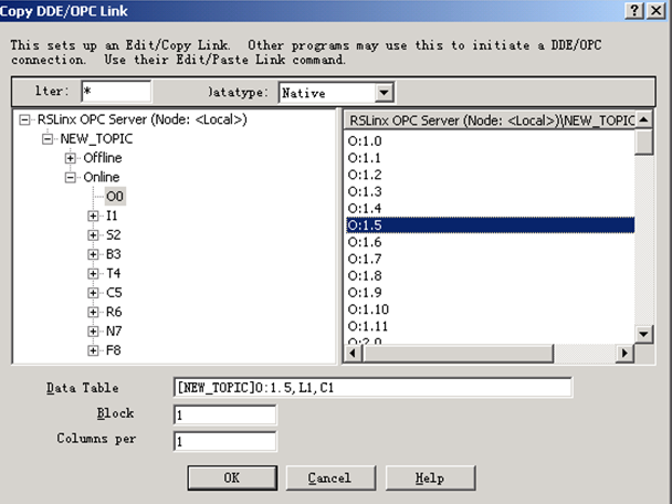 配置好一个服务器后,在如下图的列表中选定刚才配置过的PLC选项,选取Eidt-CopyDDE/OPCLink菜单项,打开CopyDDE/OPCLink窗口可以查看已经正确配置好的OPC数据项。