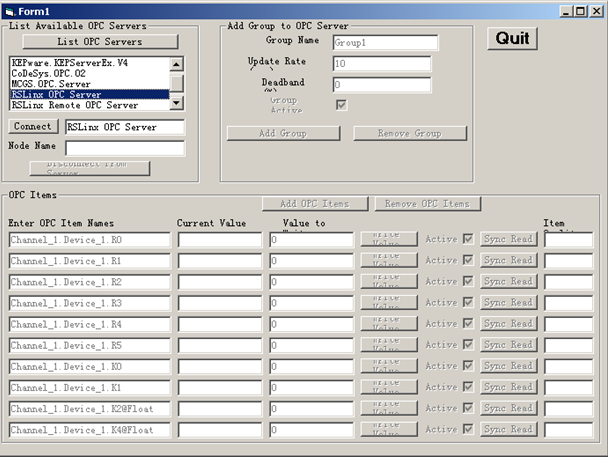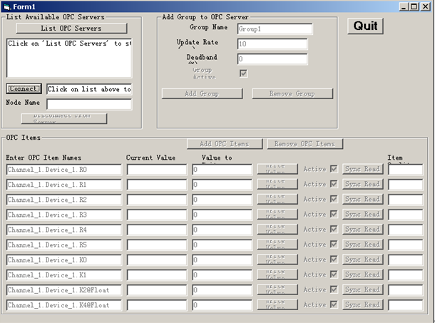 目前为止OPCServer已经正确配置。可以通过vb客户端的OPC设备构件,进行数据的连接。