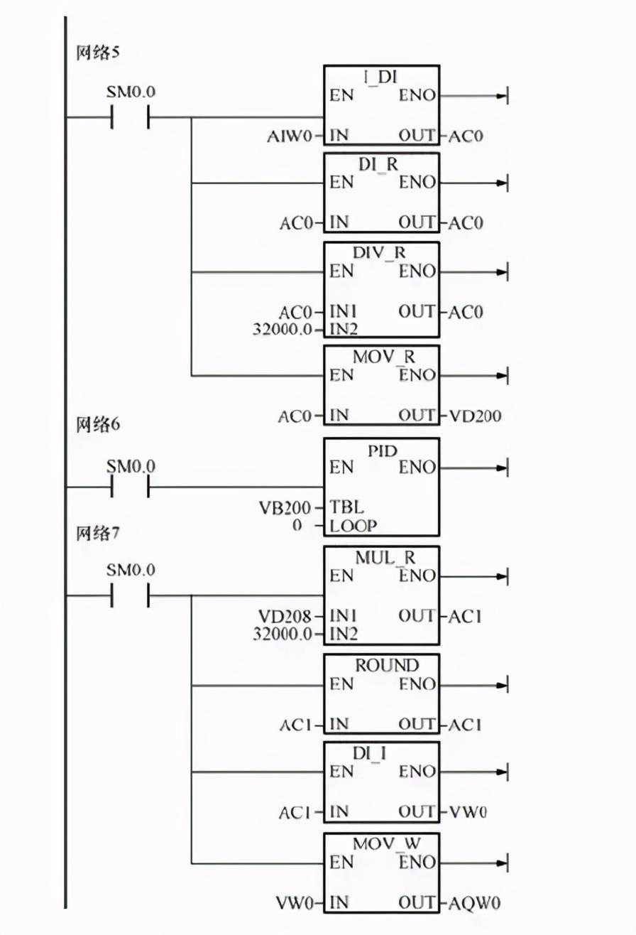 把压力传感器检测到的水位信号4~20mA送入至PLC中,PLC中对设定值与检测值的偏差进行PID运算,运算结果输出去调节水泵电机的转速,从而调节进水量。水泵电机的转速可由变频器来进行调速。