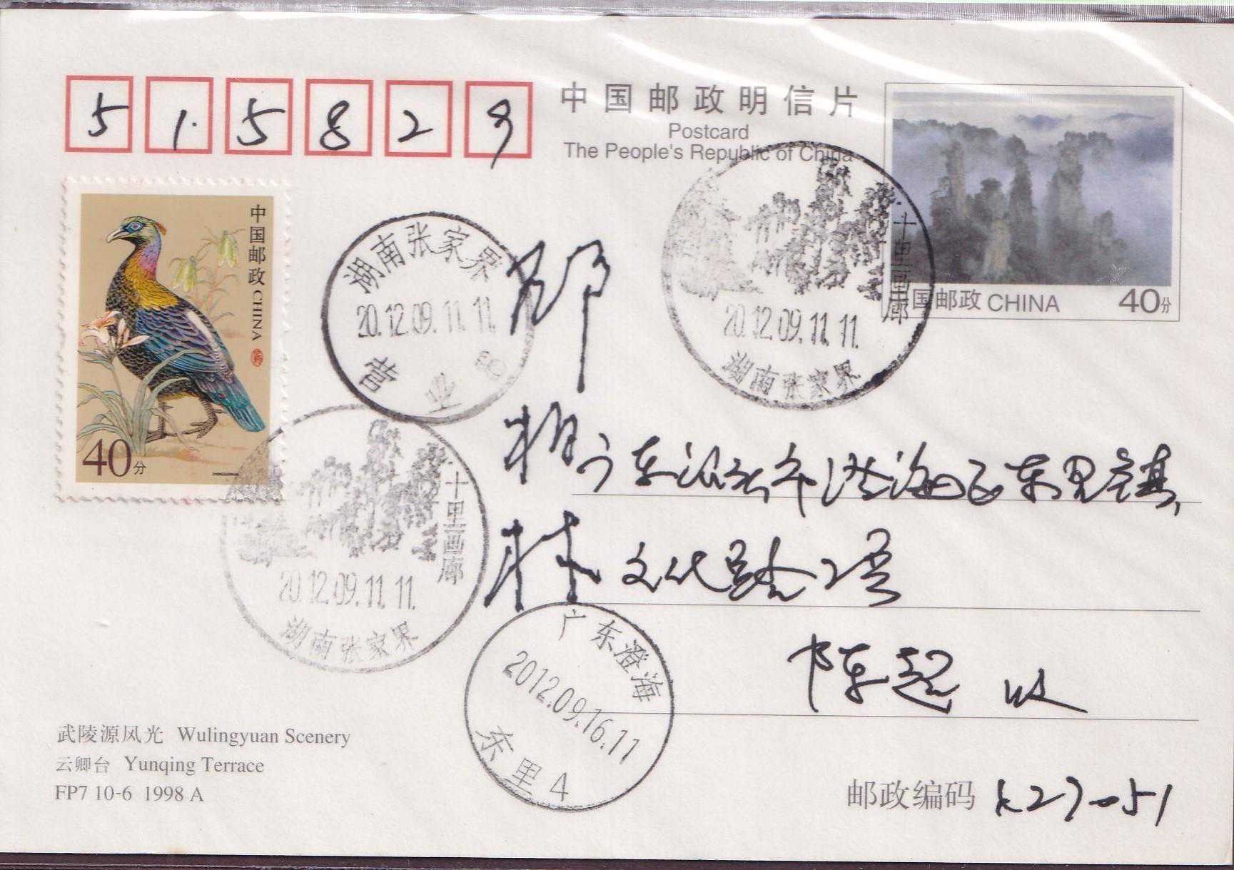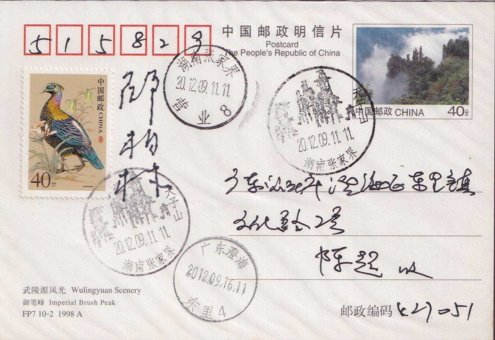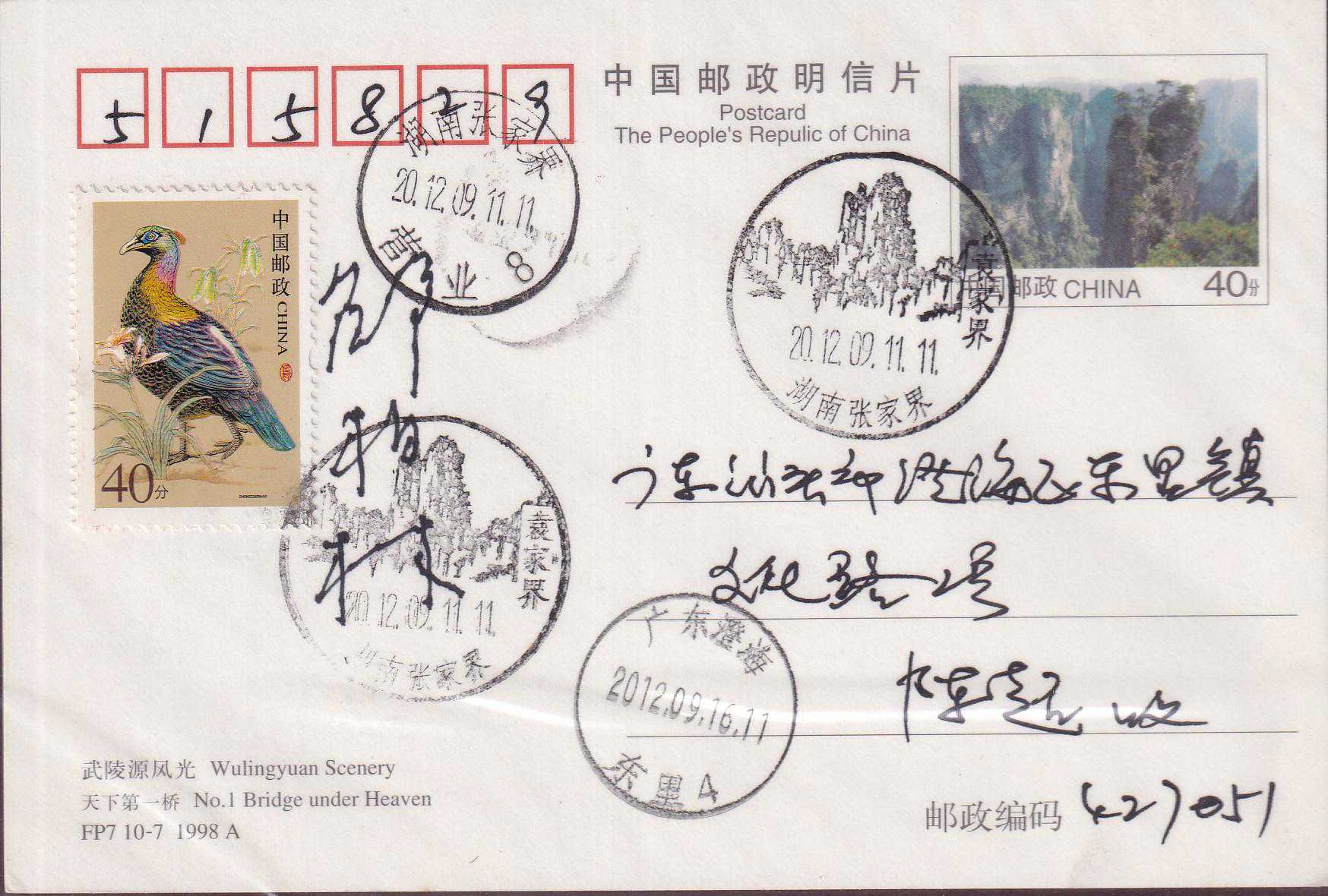 武陵源位于中国湖南省西部张家界市境内,由张家界国家森林公园、索溪峪、天子山三大景区组成。境内山奇水秀,峰峦叠嶂,林茂谷幽,人迹罕至,充满原始的神秘野趣。武陵源素有峰三千、水八百奇异的自然王国美称。1982年张家界被列为中国第一个国家森林公园。1992年武陵源被联合国教科文组织列入《世界遗产名录》。1998年7月30日,FP7《武陵源风光》邮资明信片(A组/B组)发行,明信片设计者:邵柏林。采用彩色胶印,由深圳当纳利旭日印刷有限公司印制。