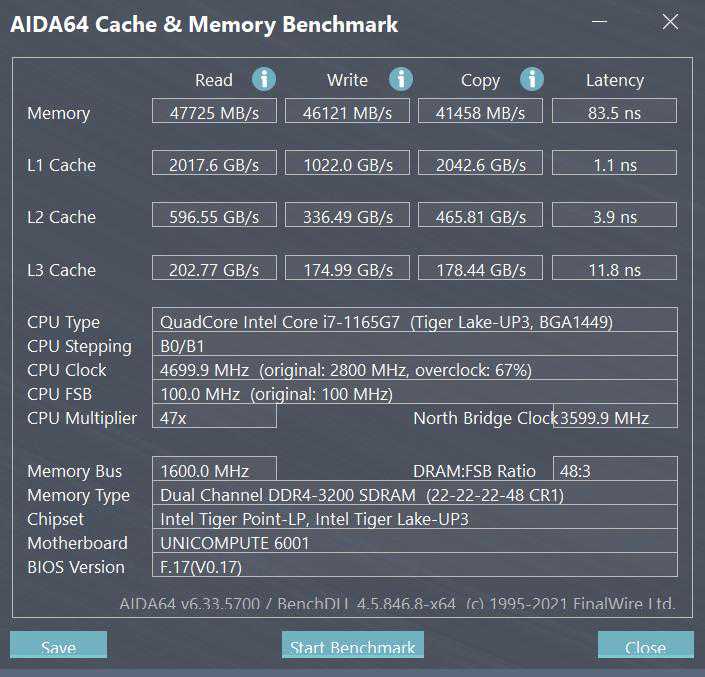 Unis14T采用了8GB+8GB3200MHz双通道内存规格。因此在AIDA64ExtremeCacheMemoryBenchmark测试测试中,对比单通道16GB的内存可为显卡带来31%的性能提升,同内存配置下性能比之MX330提升明显。