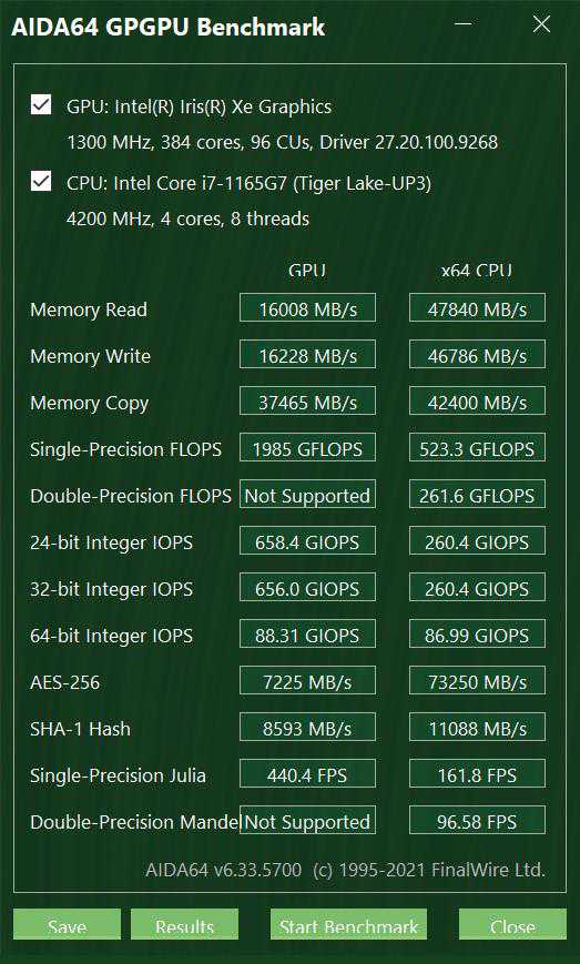 I7-1165G7拥有较高的L2和L3缓存容量,结合频率提高和微架构改进,单核性能甚至超越了很多标压处理器和台式机处理器,可以大幅提高日常办公的效率。因此在AIDA64GPGPUBenchmark测试中,Unis14T的处理器能力表现强劲,其单双精度的数据均十分可观。