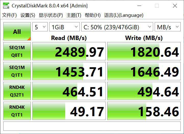 在CrystalDiskMark最新版本的测试中,Unis14T写入与读取能力比较均衡。其写入速度约为1820.64MB/s,读取速度约在2489.97MB/s。该固态硬盘在科学运算、渲染加速等测试软件中表现出了快速启动及读取等方面的优势。