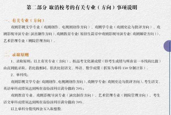 2.戏剧学、戏剧影视文学、戏剧影视导演、广播电视编导、艺术管理专业取消校考,按照高考文化课成绩排序择优录取,相关省份做分省计划。