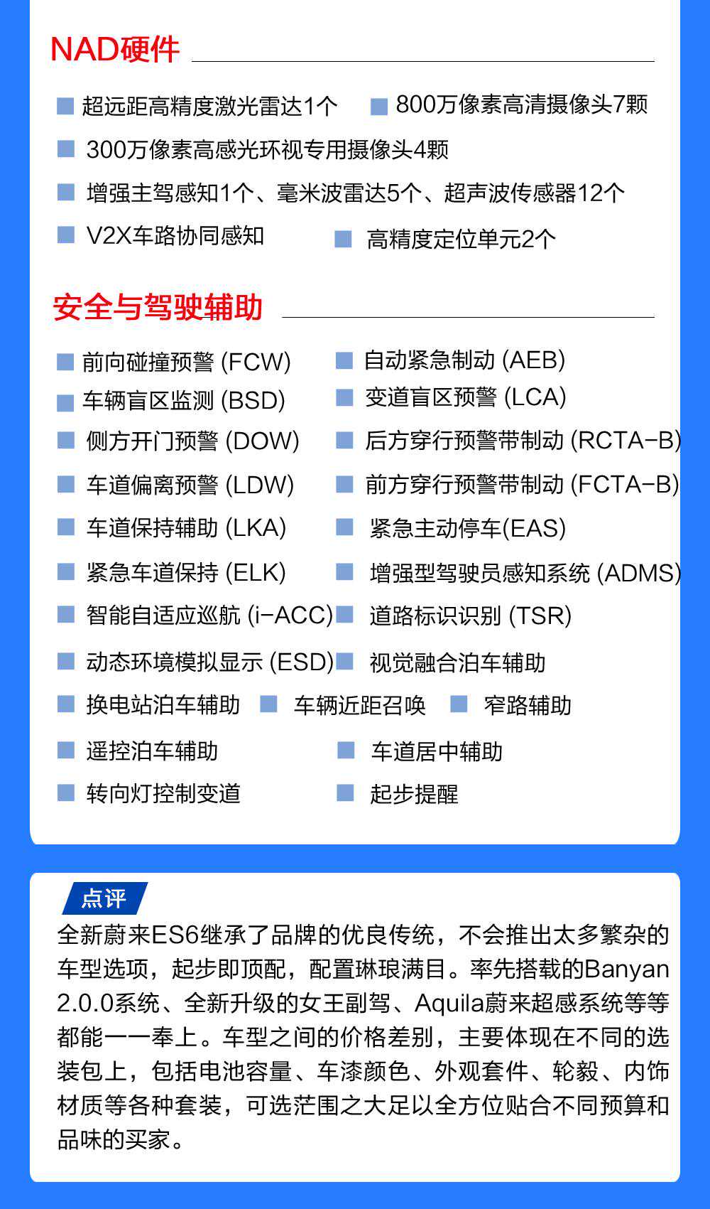 智能驾驶方面,全新ES6标配Aquila蔚来超感系统,拥有包括激光雷达在内的33个高性能传感器;标配ADAM蔚来超算平台,搭载四颗NVIDIADriveOrinX芯片,总算力高达1016TOPS。基于Aquila蔚来超感系统和ADAM蔚来超算平台,全新ES6全系标配23项安全与驾驶辅助功能。7月1日,基于BEV的NOP+正式版将提供服务;高速领航换电将会在今年三季度首批开通40座高速换电站,并逐步覆盖更多高速换电站,实现高速场景不间断的点到点领航辅助;城区NAD也将于近期在上海开通小规模体验。