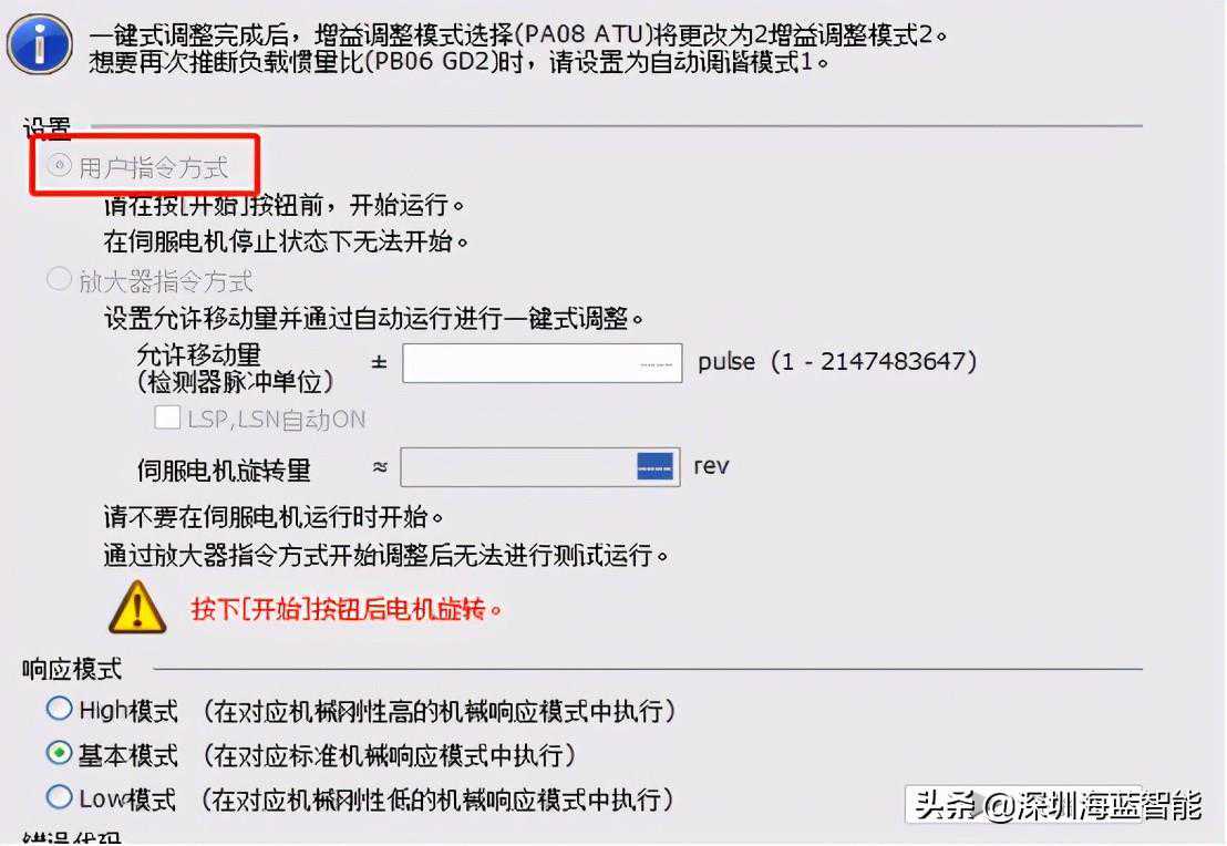 1、直接在两轴同步运行模式下进行伺服调整,一般使用用户指令模式进行整定(测试运行时,同步会断开所以需要通过程序来控制运行),如果使用放大器指令调整,由于这种方式调整运动速度不可控,同步效果不佳时容易卡死。如果在调整过程中速度较快就会卡,速度太慢又无法整定完成。这个时候就需要第二种方法。