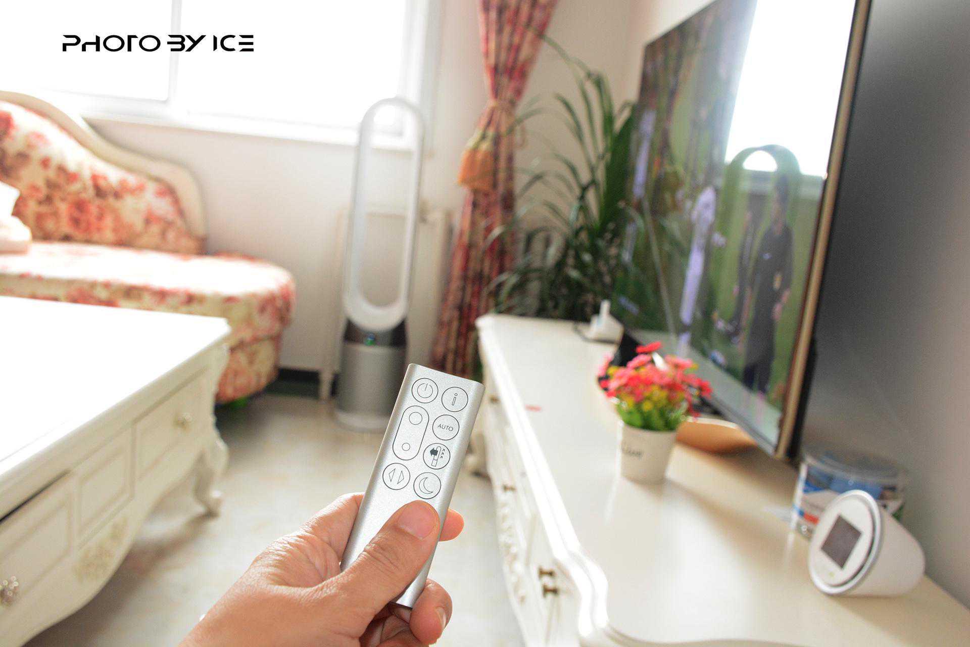 TP04空气净化风扇配有一个银色小巧的遥控器,有一定的弧形设计,弧形设计的遥控器可以吸附在TP04空气净化风扇机身出风口上,形成完美的贴合。