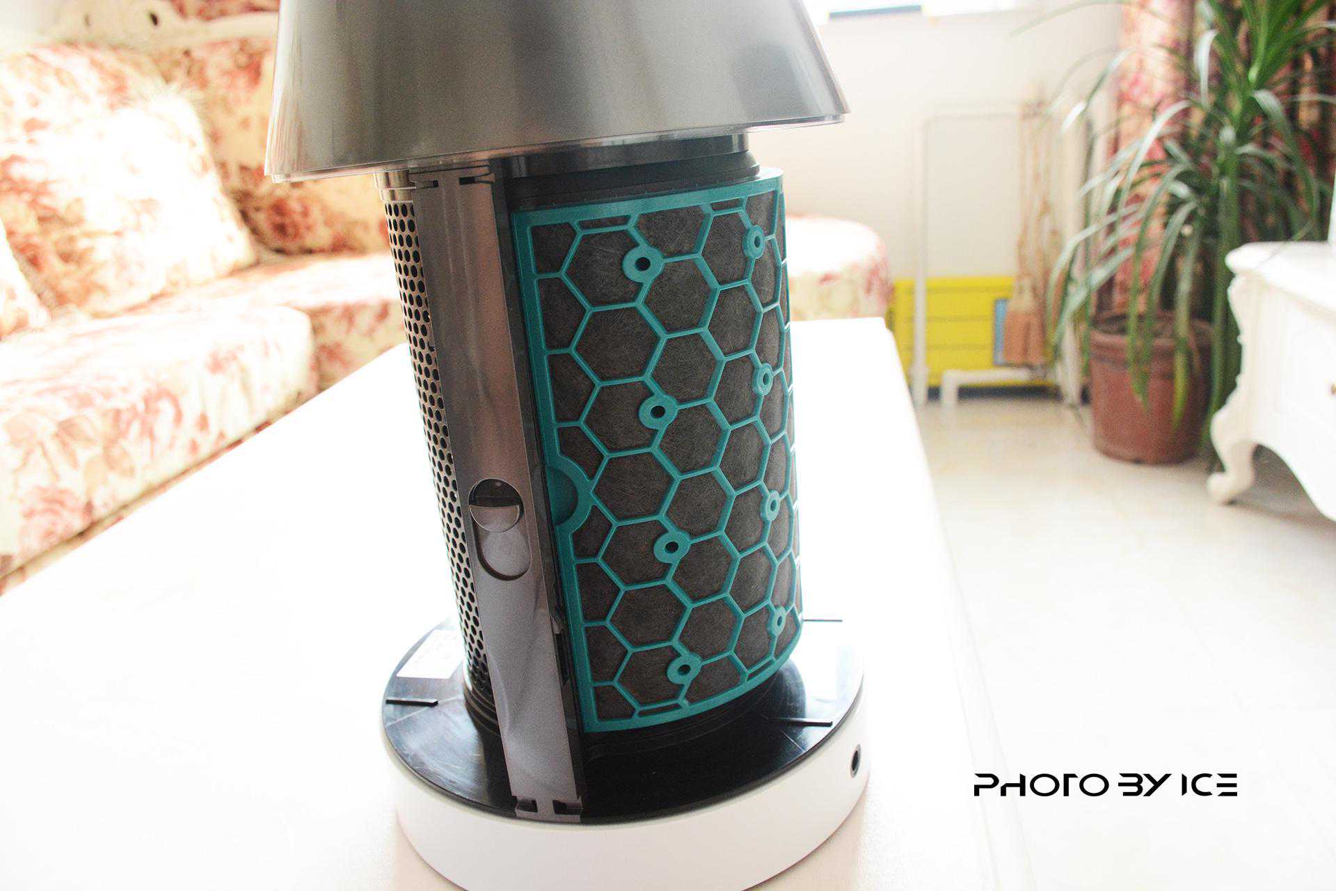 控制区域下方是TP04空气净化风扇的滤网结构,TP04空气净化风扇的滤网结构设计有活性炭滤网和PTFEHEPA滤网。这两层滤网设计也非常巧妙,均为半圆结构设计,可以很好的扣在TP04空气净化风扇的圆柱形机身上。