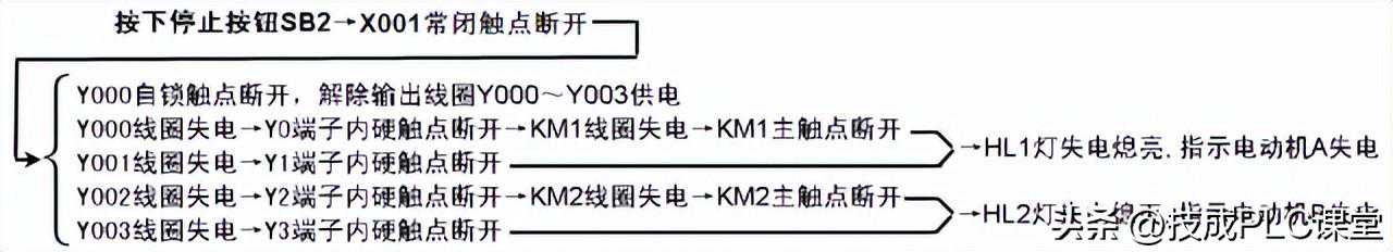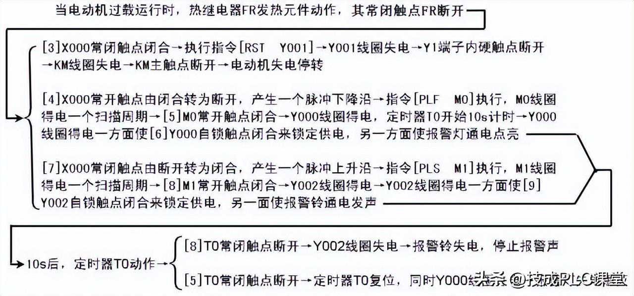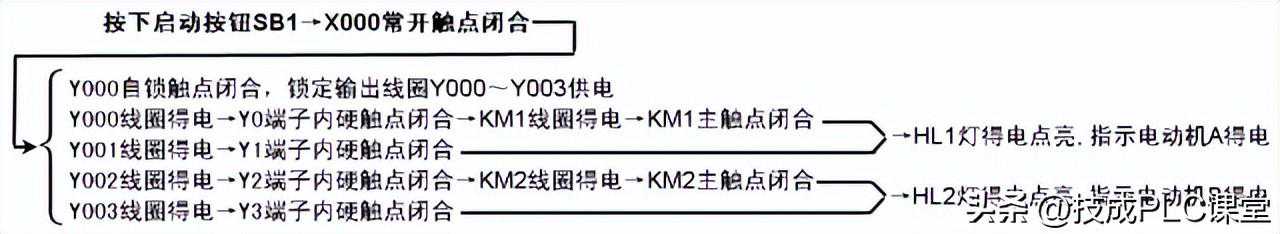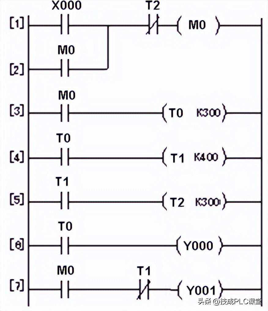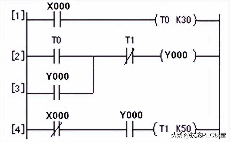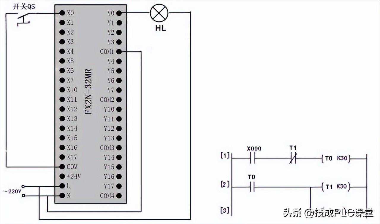 把开关QS闭合→X000常开触点闭合→定时器T0开始3s计时→3s后,定时器T0动作,T0常开触点闭合→定时器T1开始3s计时,与此同时Y000得电,Y0端子内部硬触点闭合,灯HL点亮→3s后,定时器T1动作,T1常闭触点断开→定时器T0复位,T0常开触点断开→Y000线圈失电,同时定时器T1复位→Y000线圈失电使灯HL熄灭;定时器T1复位使T1闭合,因为开关QS依旧是闭合状态,所以X000常开触点也是闭合,定时器T0又开始重新3s计时。