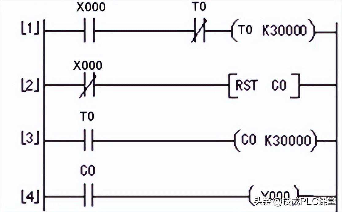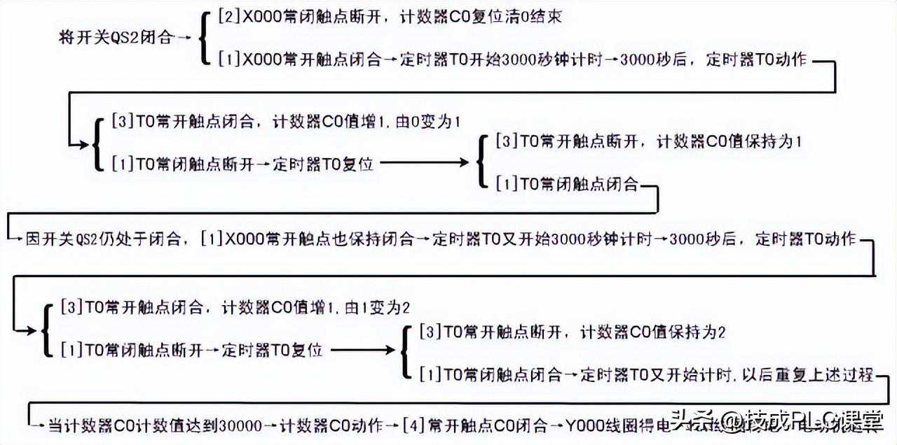 图中的定时器T0定时单位为0.1s(100ms),它与计数器C0搭配用之后,它的定时时间T=30000×0.1秒×30000=90000000秒=25000小时。如果需要重新定时,可以把开关QS2断开,让[2]X000常闭触点闭合,然后“RSTC0”指令执行,之后计数器C0进行复位,然后再闭合QS2,就会重新开始250000小时定时。