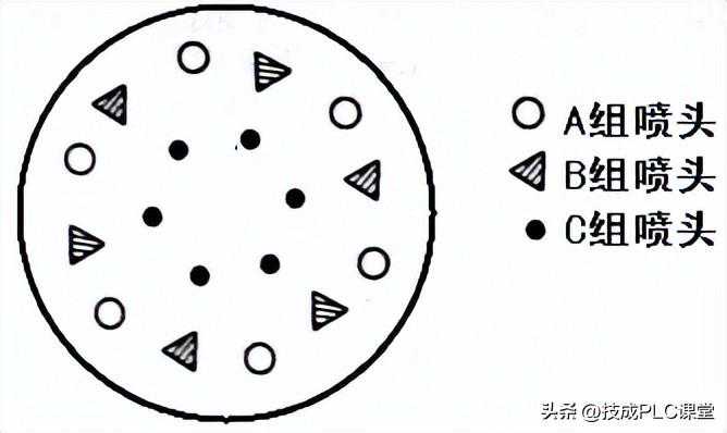 当按下起动按钮后,A组喷头先喷5s后停止,然后B、C组喷头同时喷,5s后,B组喷头停止、C组喷头继续喷5s再停止,而后A、B组喷头喷7s,C组喷头在这7s的前2s内停止,后5s内喷水,接着A、B、C三组喷头同时停止3s,以后重复前述过程。按下停止按钮后,三组喷头同时停止喷水。