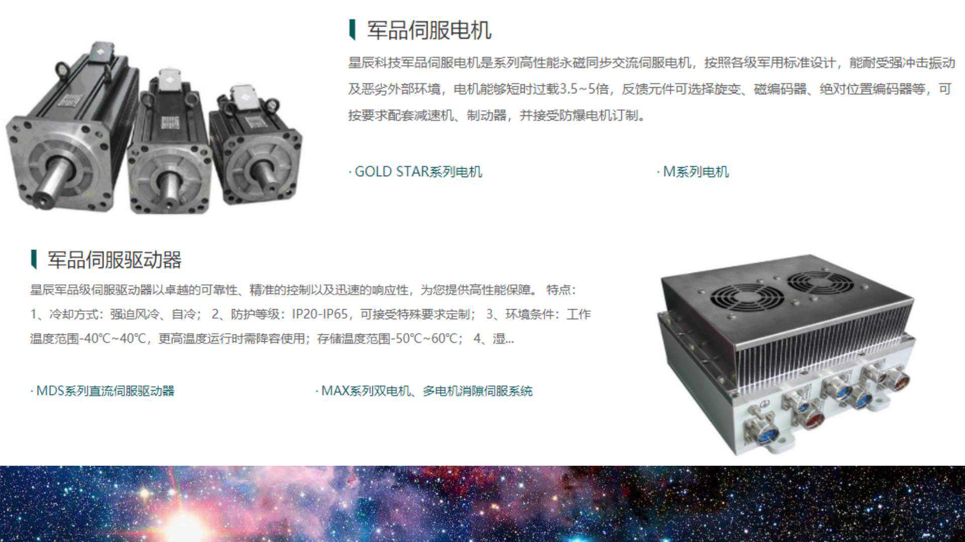 具体说一下星辰科技,是航天军工高端伺服领域的头部企业,注意了这是家民企,军工给出的要求就是,要“100%的元器件数量、100%的元器件种类”,全部国产化的要求,目前已经推出了符合要求的纯100%国产伺服系统。有些朋友可能不太理解为什么非要双100%国产,看看这些伺服都是用在哪的,军用雷达、神州飞船、嫦娥工程、天宫空间站工程、还有历年国庆阅兵上的武器装备,还是我国大型舰船部分武器系统伺服的供应商。