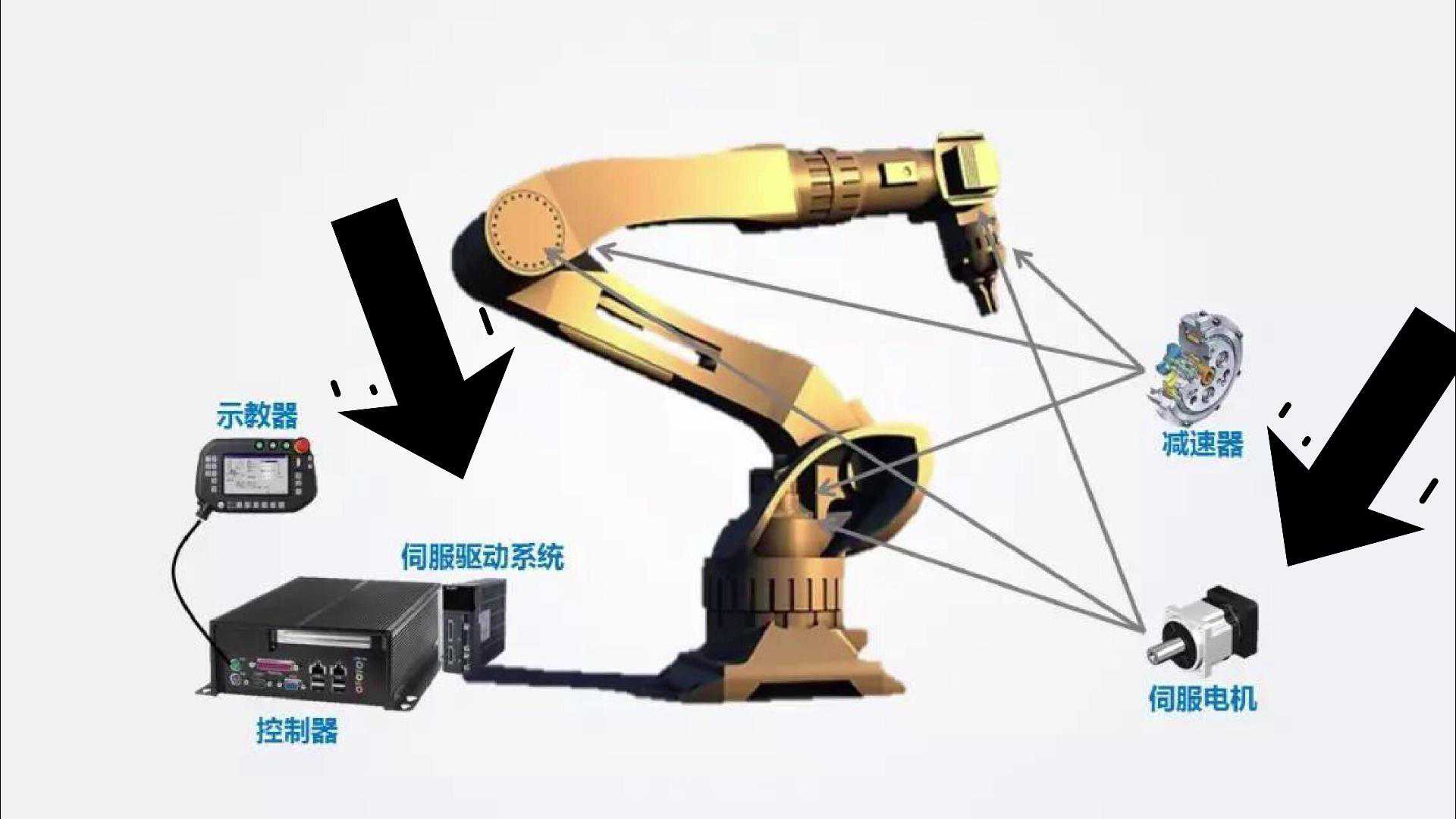 我拿6轴机器人举个例子,方便大家理解。六轴机器人有6个关节,每个关节处都配备了一台伺服电机,机器人为什么会动?就是靠这个伺服电机去实现的,大家可以把它想象成是我们人手的各个关节的动作。控制器就是我们人类的大脑,它会根据程序的设定,发出各种指令,伺服驱动就相当于人体的神经系统,把控制器发出的指令,传导给伺服电机,最后伺服电机再根据指令,来实现机器人各个方向的运动。
