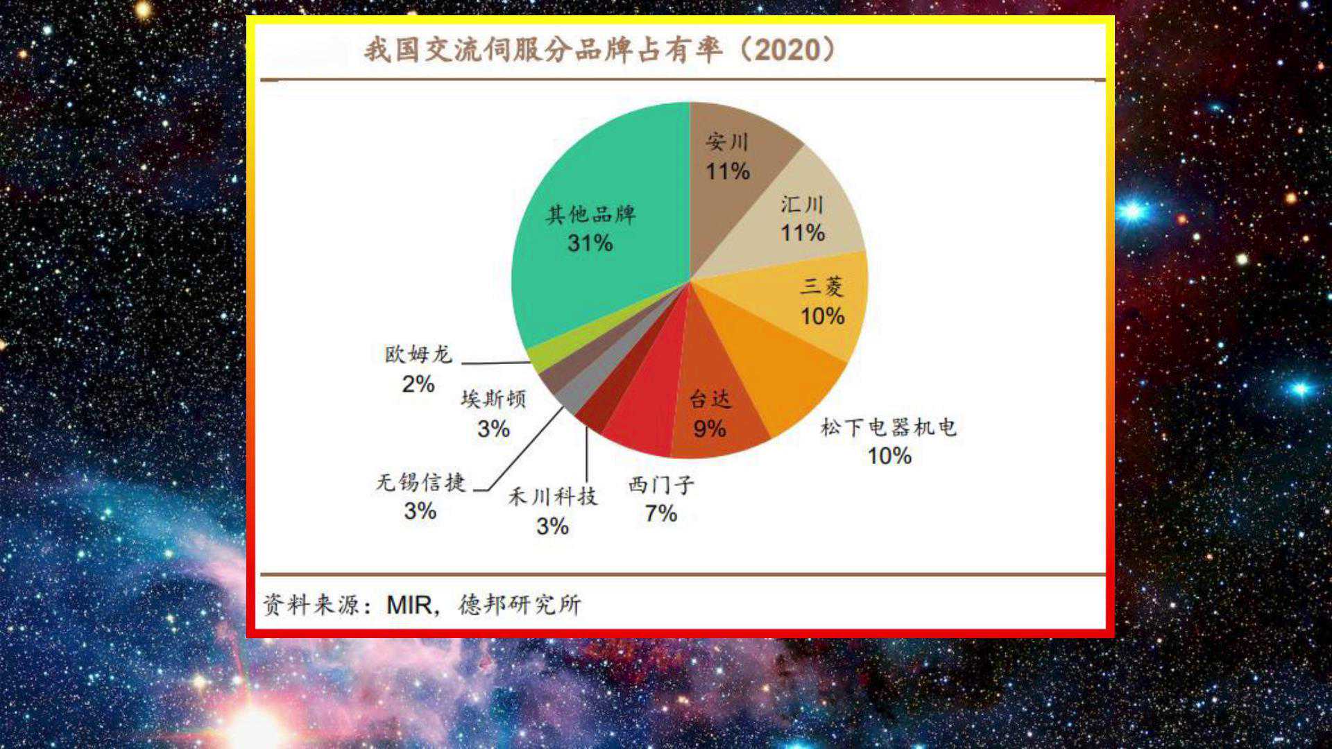 工业机器人现在普遍用的都是交流伺服系统,我们看一下国内交流伺服系统的市场占有率,2020年,日本安川和国产汇川技术,以11%的份额,并列国内市场第一名,三菱和松下占10%,台达占9%,西门子占7%,国产的禾川科技、埃斯顿、信捷电气,以3%的份额并列第5名。