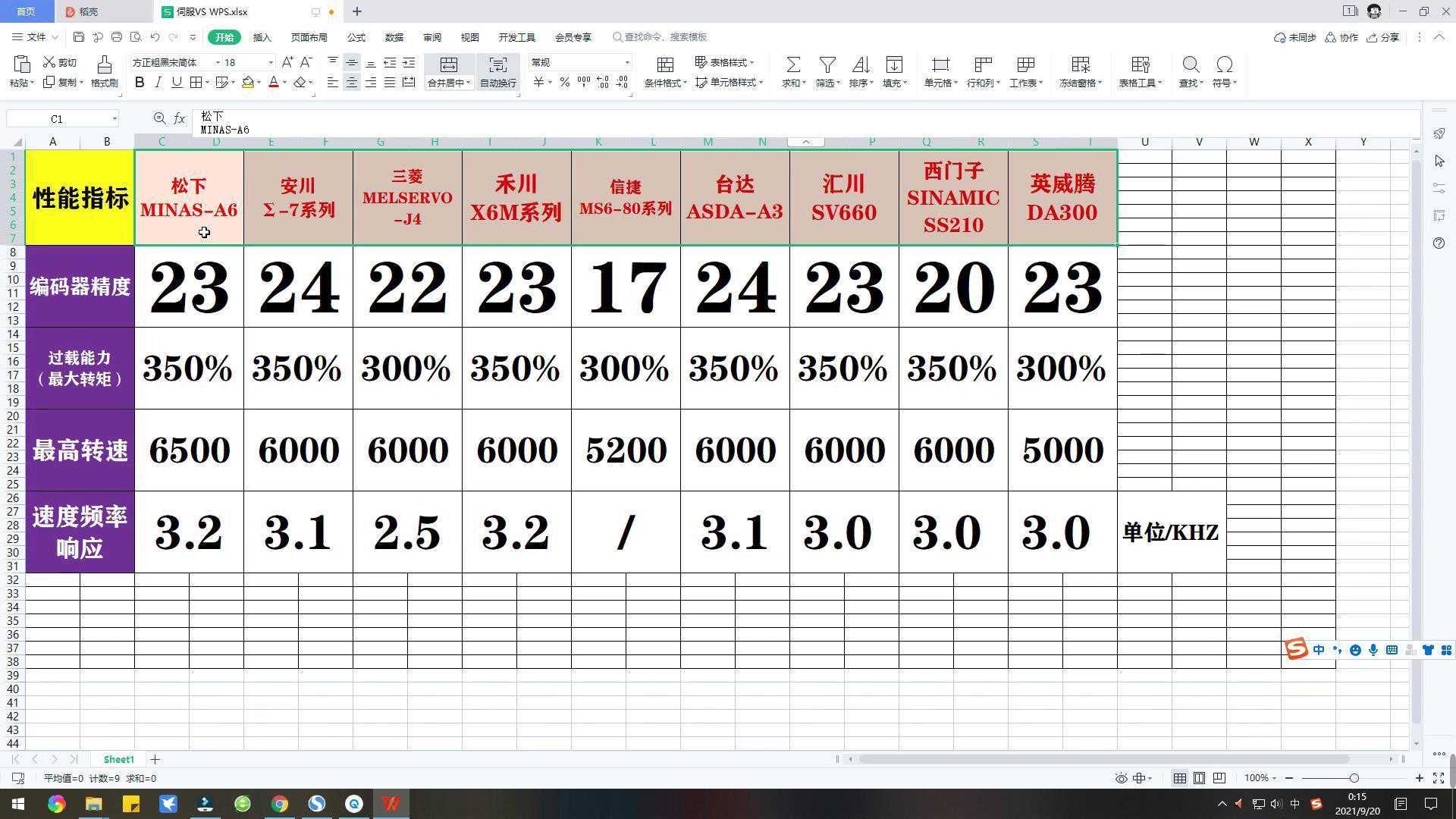 先说一下国产伺服老大汇川技术,国内综合性工控龙头。这家公司,你们可以把它看做是缩小版的华为,大部分创业元老,是从华为公司出来的高管。伺服驱动器、伺服电机、编码器,都是汇川自主研发生产的,我找了国内市面上比较流行的9个伺服品牌,我们就拿汇川的SV660型号,和安川、三菱、西门子等品牌做个简单比较。看一套伺服的性能怎么样,主要就是看这四个指标,编码器的精度,电机的过载能力,最高转速,还有速度频率响应的能力。