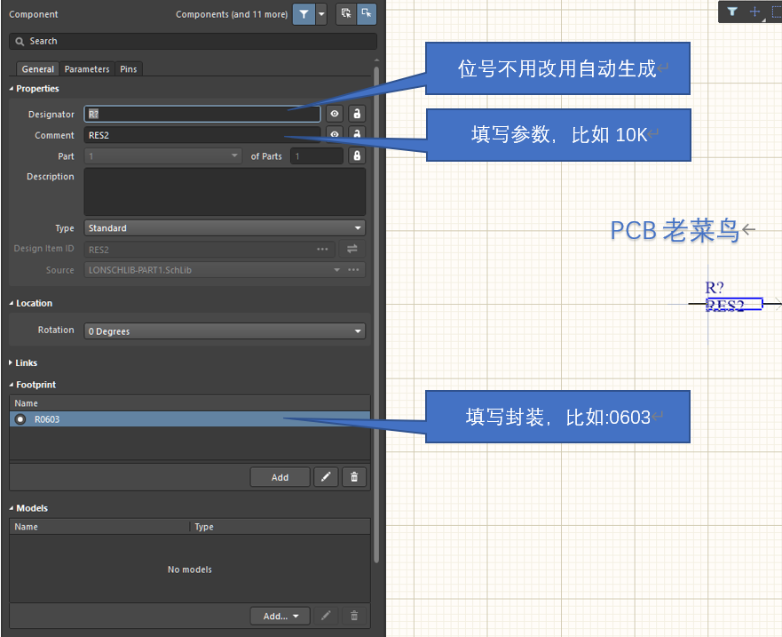 上图为放置器件状态,在放置器件状态按TAB键,出现下图所示:器件参数信息,重点修改comment(参数10K必填写),footprint(封装必填写),description描述等其它可填,可不填的。