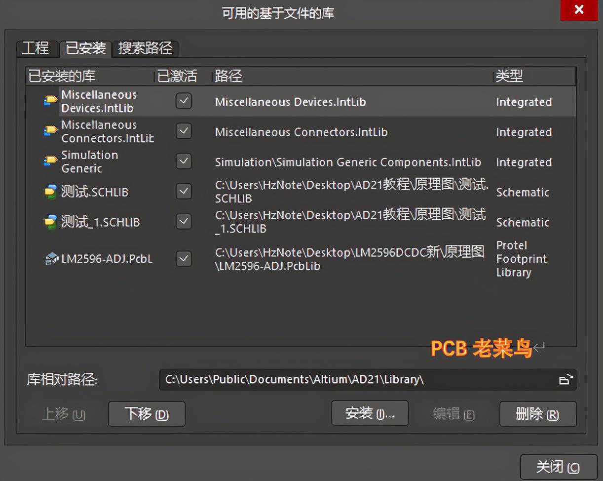 在对话框中,选中一个库,可以上移和下移按钮是用来改变元件库排列顺序的。