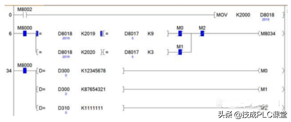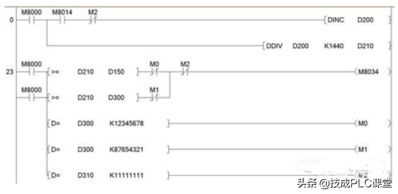 如果使用PLC来设置密码,停止设备工作我们最终要设定禁止PLC输出,下来就是如何设计时间,是按照工作时间来计算还是按照日期,我们以半年的时间为期限,程序设置的方法有许多如下图,根据特殊软元件M8014(1分钟时钟信号)来换成算天数。