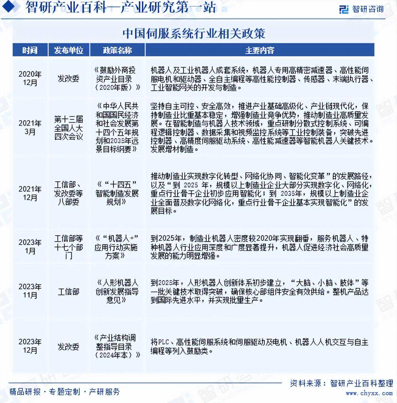 近年来,我国出台了一系列政策推动伺服系统行业创新发展。2021年3月第十三届全国人大四次会议发布《中华人民共和国国民经济和社会发展第十四个五年规划和2035年远景目标纲要》,提出突破高精度伺服驱动系统等关键技术。同时发展增材制造,推动我国伺服系统行业向控制性强、高精度发展。2023年1月,工信部等十七个部门联合发布《“机器人+”应用行动实施方案》,提出到2025年制造业机器人密度较2020年翻倍的发展目标,将推动机器人需求量增加,拉动上游伺服系统行业不断扩容。《产业结构调整指导目录(2024年本)》将高性能伺服系统和伺服驱动及电机列入鼓励类。有助于推动我国高性能伺服系统技术创新发展,推动我国伺服系统行业高质量发展。