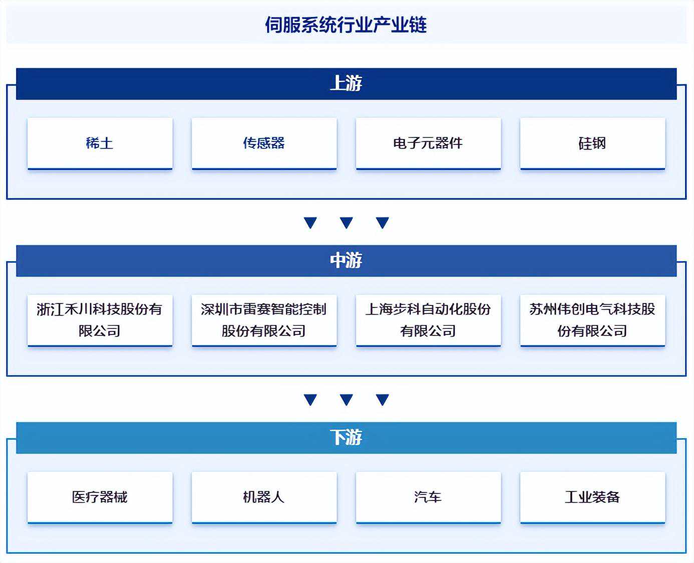 伺服系统行业产业链上游为原材料,主要为稀土、传感器、IC及其他电子元器件、硅钢等金属;中游为伺服电机制造、伺服驱动器制造以及数控系统研发等环节;伺服系统下游应用领域包括医疗器械、机器人、汽车制造以及工业装备等领域。中国伺服系统行业产业链如下图所示: