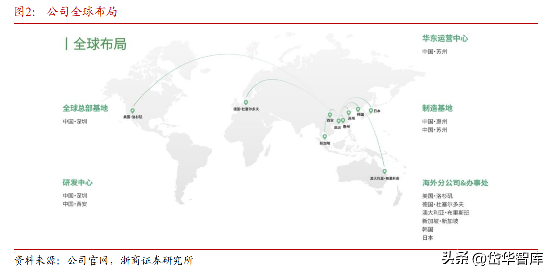 公司市场拓展以欧洲为主、美国为辅,全球化迈出重要步伐。公司总部位于深圳;已建立惠州和苏州制造基地、西安研发中心、华东运营中心,并在美国、德国、澳大利亚、新加坡等地设立全球分公司,并以单点为核心向周围市场辐射,逐步铺设海外销售平台。