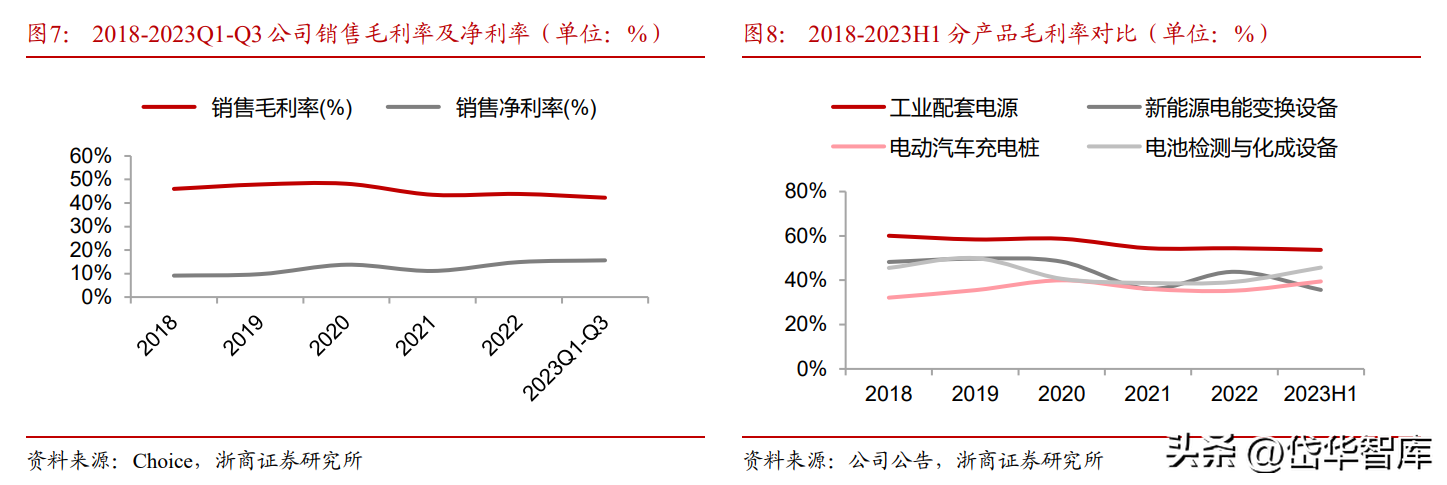 分业务来看,公司工业配套电源业务毛利率近五年一直处于较高水平,保持在50%以上。2023年上半年,工业配套电源、新能源电能变换设备、电动汽车充电桩、电池化成与检测设备毛利率分别为53.68%、35.64%、39.46%、45.71%。