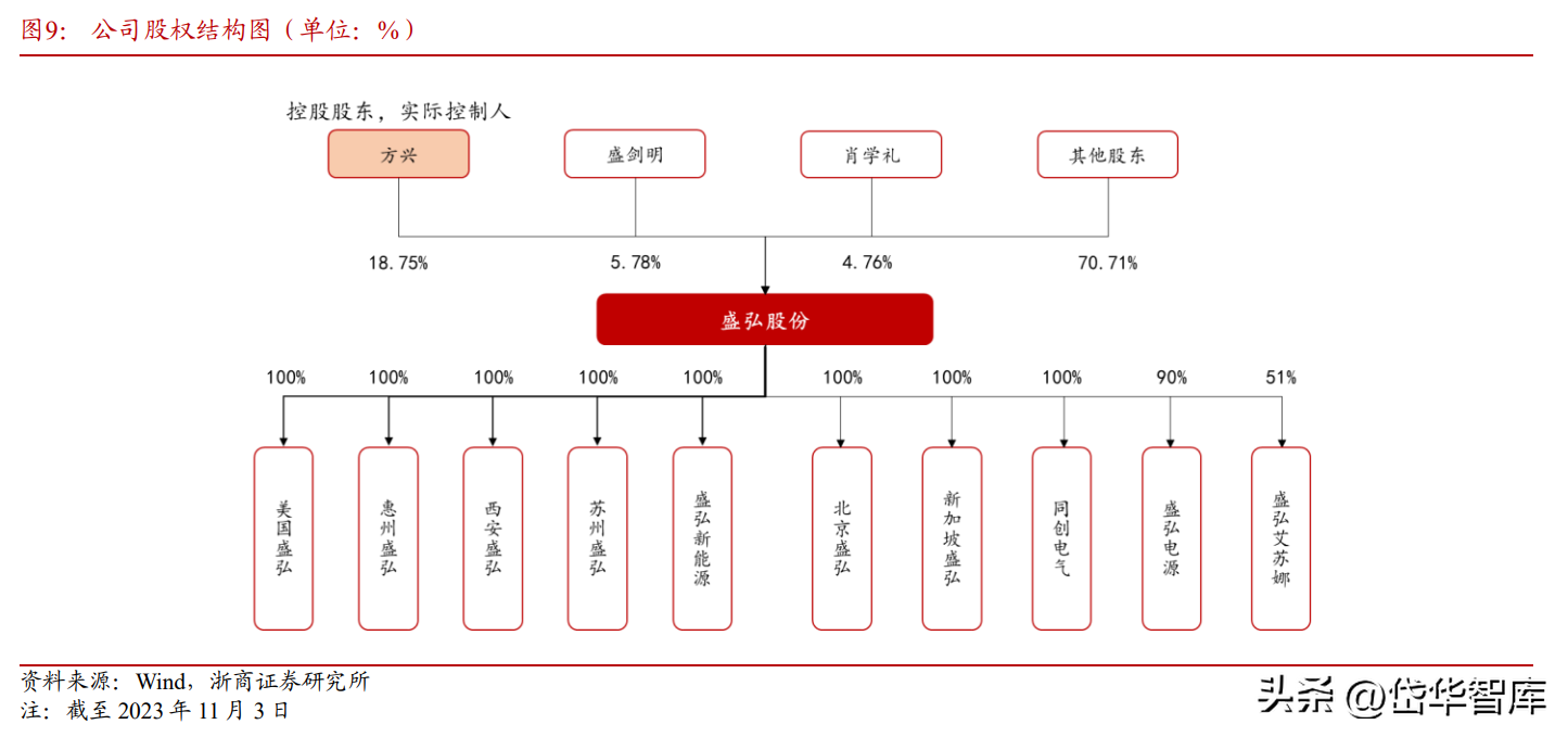 方兴为公司控股股东、实际控制人。截至2023年11月3日,公司控股股东和实际控制人为方兴,持股比例为18.75%。方兴担任公司董事长、总经理。第二、第三大股东为盛剑明和肖学礼,二人分别持股5.78%和4.76%。公司下辖苏州盛弘、惠州盛弘等子公司,负责研发、生产、销售等环节。