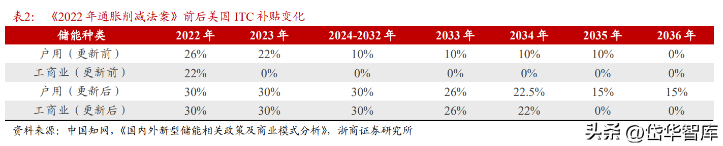 美国IRA政策细则出台,大储、工商储项目落地有望提速。随着电网升级力度加大、并网改革法案落实,若加息周期结束,美国大储发展有望提速。《2022年通胀削减法案》规定将独立储能纳入抵免范围(工商业储能5kWh、户用储能3kWh),同时将ITC补贴时间延长到2035年,2033年开始退坡,并提升了抵免上限。此外,符合一些特殊标准的储能项目,还可以获得额外的税收抵免。