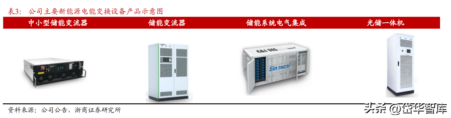 公司储能产品覆盖大储和工商储场景。公司新能源电能变换设备产品主要包括储能变流器、储能系统电气集成、逆变升压一体舱,此外还有光储一体机、直流变换器、储能一体柜等其他产品。该类产品主要解决储能电池和电网之间的双向电能变换及传输,可以广泛应用于发电侧、电网侧、工商业用户侧、微电网的电力储能;中小型储能变流器和储能系统电气集成主要应用于工商业用户侧,大型储能变流器和逆变升压一体舱主要应用于发电侧、电网侧。