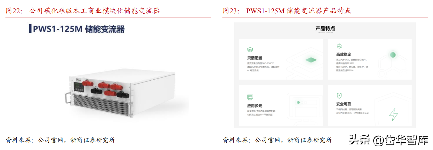 公司发布全球首款碳化硅版本工商业模块化储能变流器。公司发布新一代工商业模块化储能变流器——PWS1-125M,采用第三代半导体碳化硅作为核心功率器件,为全球首款碳化硅版本工商业模块化储能变流器。碳化硅器件具备耐高压、耐高温、体积小、响应速度快等特点,使得PCS在额定功率工况下,平均效率提升1%+,模块功率密度整体提升25%+。