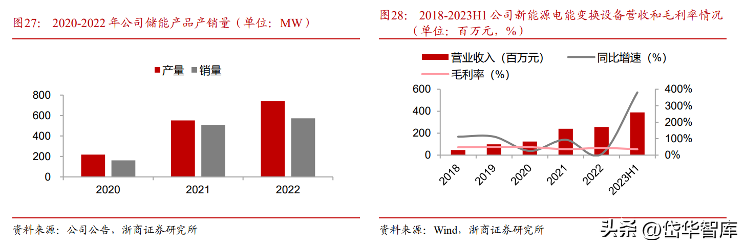 新产能建设为未来业务扩张奠基。2021年,盛弘股份旗下惠州工业园正式落成。2023年,子公司苏州盛弘年产5GW储能设建设项目顺利投产。2023年10月24日,公司公告拟在西咸新区沣东新城建设盛弘电气西北总部及研发制造基地,主要从事工业电力电子设备、工业特种电源设备、电动汽车充电模块及系统、工商业储能变流设备及系统、新能源装备大功率定制化电源系统等产品的研发及制造业务,项目总投资7亿元。从业务体量来看,2022年,公司储能产品销量572.92MW;2023年上半年,公司新能源电能变换设备业务营收达到3.89亿元,同比增长380.73%。