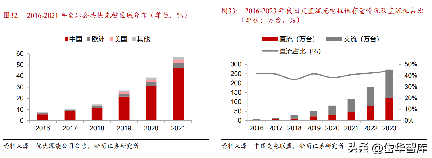 公共直流充电桩占比有望进一步提升。根据IEA数据,2021年末全球公共快充充电桩(功率大于22KW)保有量中,中国占比达到82.60%,为快充充电桩主要市场。2023年末中国公共直流充电桩占公共充电桩的比例为44%,在新能源汽车销量增长以及充电桩建设政策激励的推动下,随着新能源汽车快速充电需求的增加与充电设备技术的发展,直流充电桩未来占比有望进一步提高。