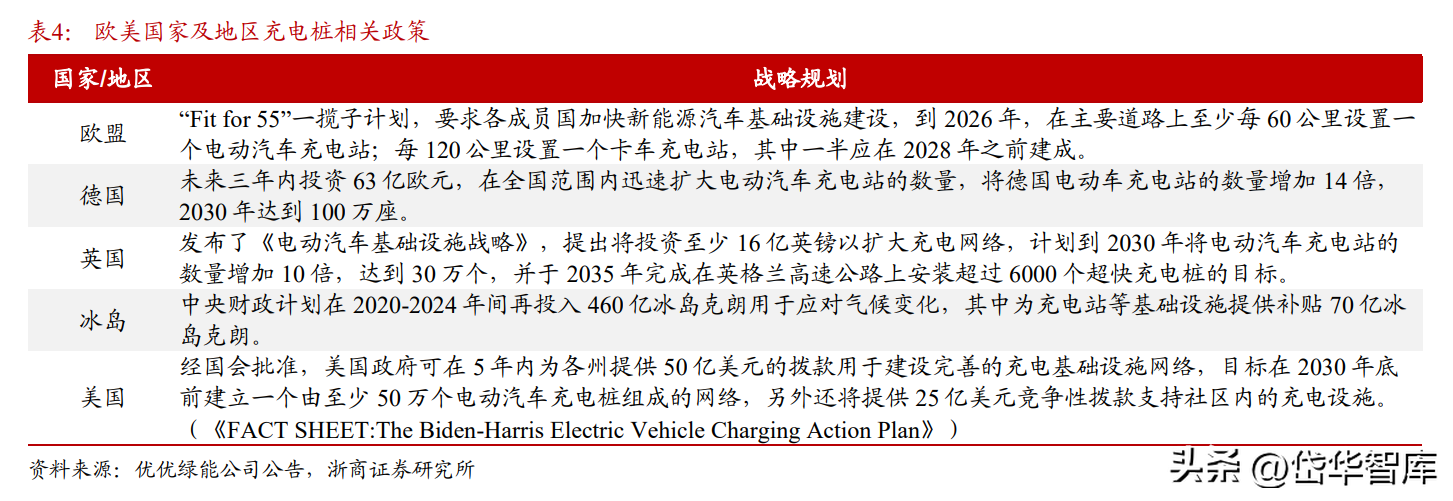 为缓解车桩比矛盾,欧美政府明确充电桩发展目标,海外市场有望高增。欧洲作为全球第二大新能源汽车市场,公共充电桩数量仅次于中国,欧盟委员会在其“Fitfor55”环保减排一揽子计划中提出,各成员国要实现主要道路每隔60公里就有1座新能源汽车充电站,为欧洲区域的充电站建设设立了明确的目标。