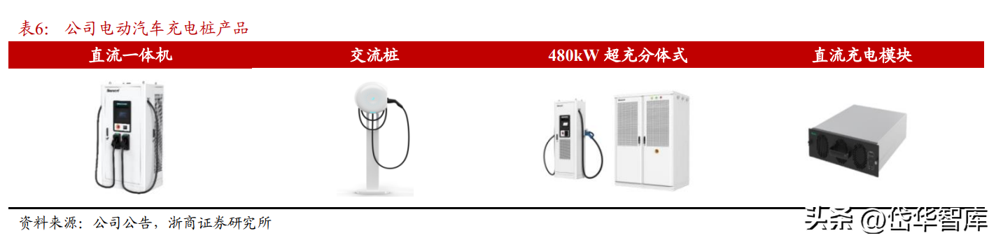 公司依托电力电子变换和控制技术,布局充电桩业务。公司电动汽车充电桩产品主要包括直流桩和交流桩、一体式和分体式等多种产品类型;同时,公司实现充电模块的自产自研,充电桩模块涵盖15kW、20kW、30kW、40kW等功率等级。目前,公司在充电桩领域已有50多个不同规格充电产品、100多个独有充电控制技术、6万多个充电系统在线运行、60多万个充电模块应用于市场。