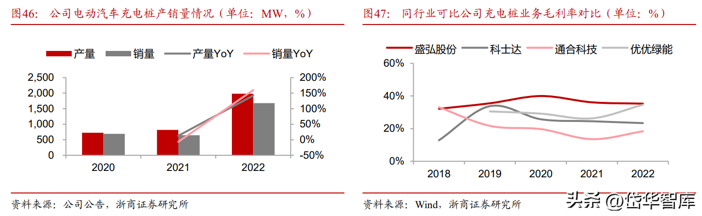 充电模块协同降本,毛利率稳居行业前列。公司积极拓展市场,2023年可支持超充设备的订单增加200%,生产线从3条扩充到9条,产能大大提升。2020-2022年公司充电桩业务毛利率分别为39.97%、36.12%、35.29%,显著领先于同行业可比公司。公司依托传统主业在电力电子领域的经验积累开发充电模块,同时器件复用降低采购成本,目前量产已初具规模,可凭借自研模块降低生产成本。