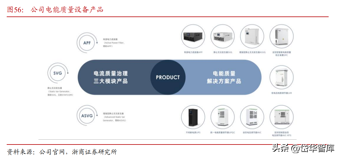 公司深耕电能质量设备多年,产品体系全面。目前公司电能质量设备产品主要包括有源滤波器(APF)、静止无功发生器(SVG)、三相不平衡调节装置(SPC)、动态电压调节器(AVC)、低压线路调压器(LVR)、不间断电源(UPS)等,已经覆盖谐波治理、无功补偿、地铁储能、电压暂降、保障用电安全的工业UPS等领域。