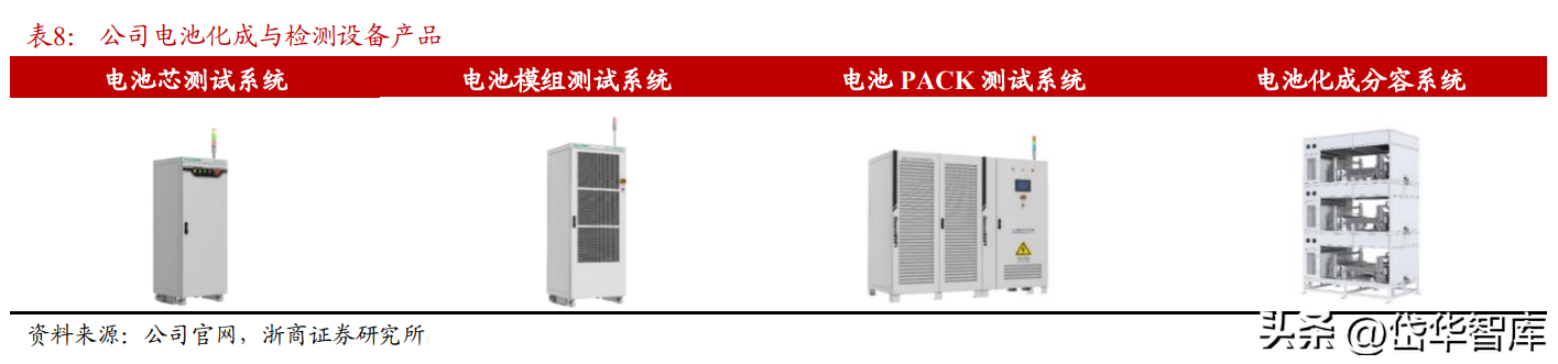 公司电池化成与检测设备主要用于进行充放电检测及电池化成和分容。公司生产的电池化成及检测设备包括锂电池系列和铅酸电池系列,产品主要适用于电池研发及制造过程中的充放电检测及电池化成和分容等工序。电池化成设备主要用于单体电池的活化环节,给新生产的单体电池做初次充放电激活。电池检测设备主要用于动力锂电池配组成为动力锂电池组以后的检测和模拟测试。这个环节关系到锂电池组的性能稳定性和可靠性,对其出厂测试和评估有着重要的作用。