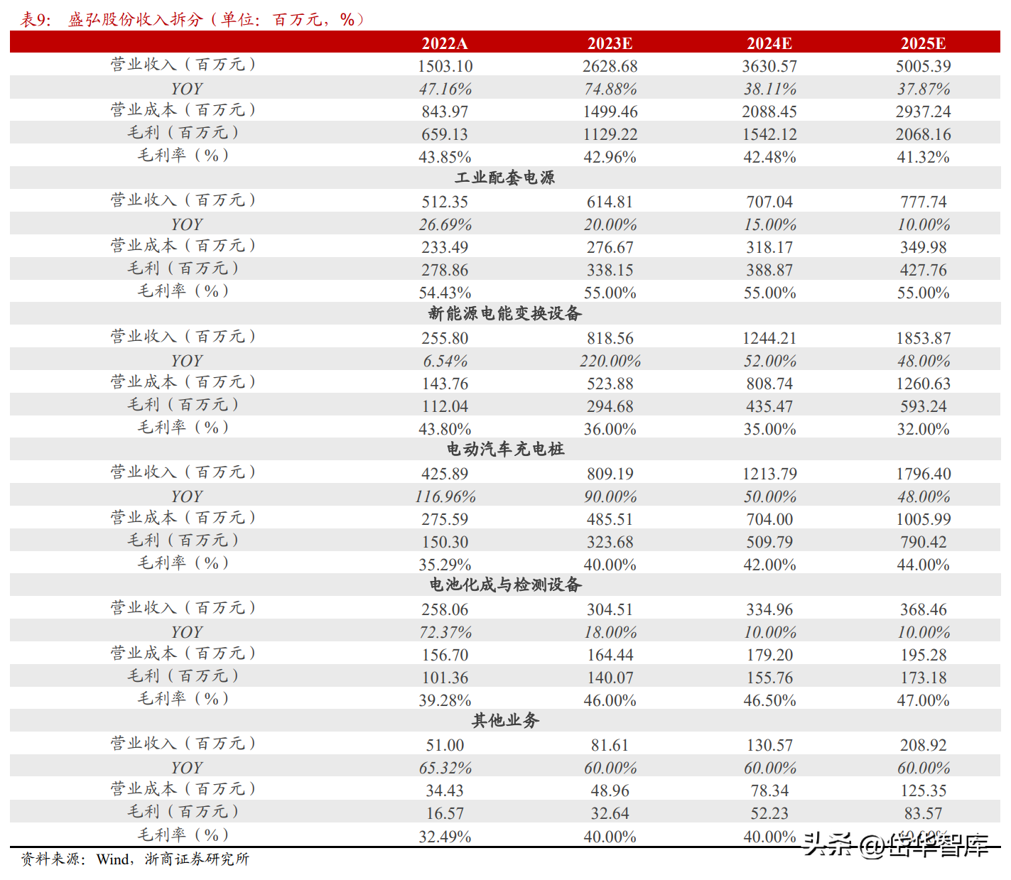公司储能PCS、系统集成业务覆盖大储和工商储场景,目前加速推进在欧美等高毛利市场的布局和销售,有望拓宽未来成长空间。考虑到2022年基数较小且2023年储能行业高增长,预计2023-2025年,公司新能源电源变换设备业务收入增速分别为220%、52%、49%,对应收入分别为8.19、12.44、18.54亿元。由于目前储能行业竞争加剧,预计2023-2025年公司新能源电源变换设备业务毛利率分别为36%、35%、32%。