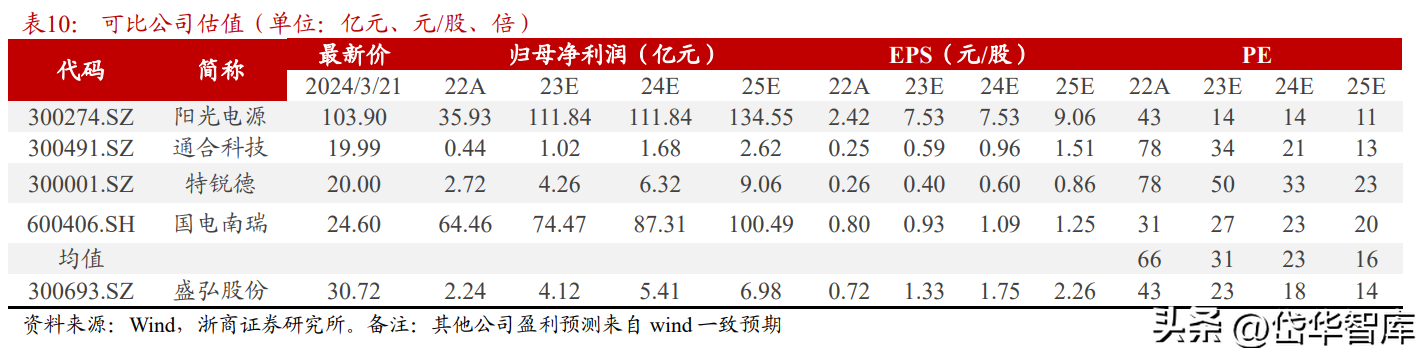 我们选取阳光电源作为新能源电能变换设备业务、通合科技和特锐德作为电动汽车充电桩业务、国电南瑞作为工业配套电源业务的可比公司,2024年可比公司平均PE为23倍。