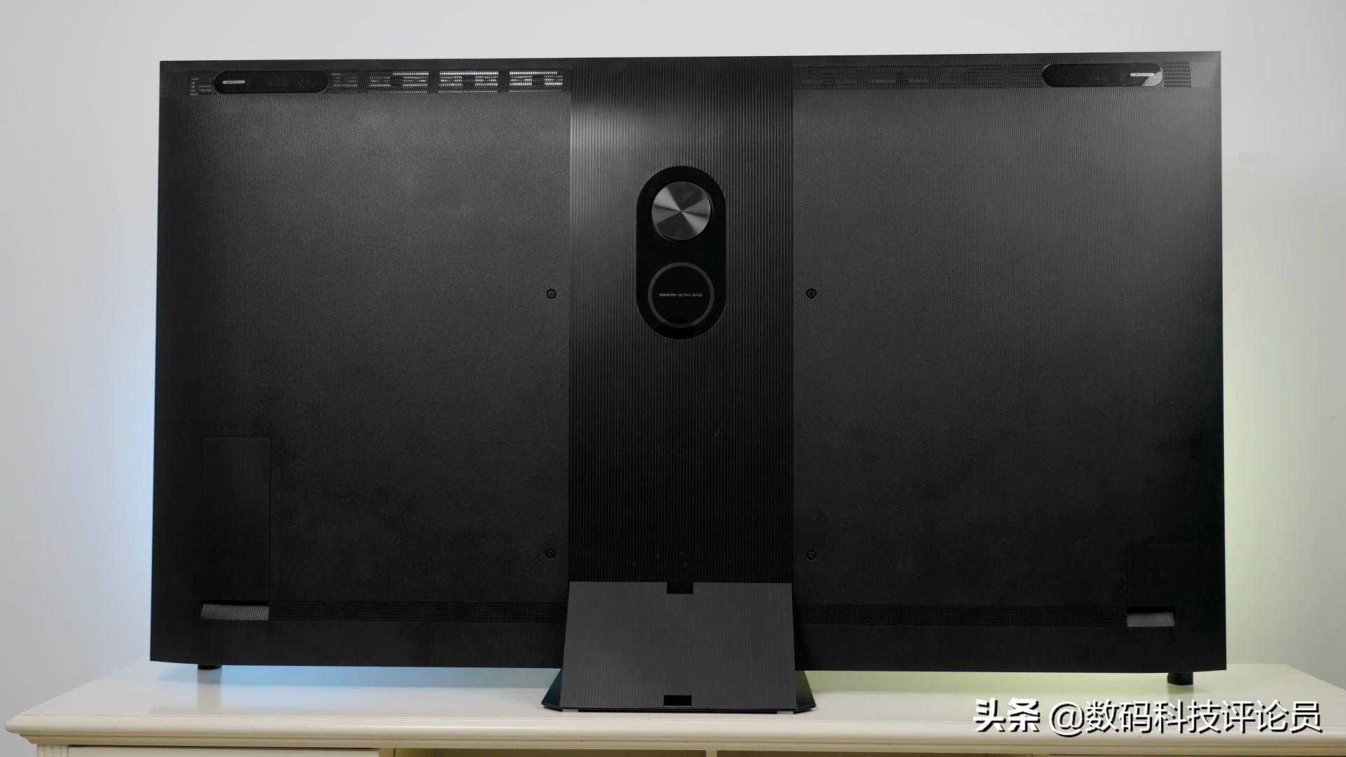背板看过去也是整洁干净,平整的背面没有多余的点缀。而在电视背部靠上位置的的两侧,各配置了一枚扬声器,背部支架上还配有一枚独立低音大音腔,这样的设计自带立体声。