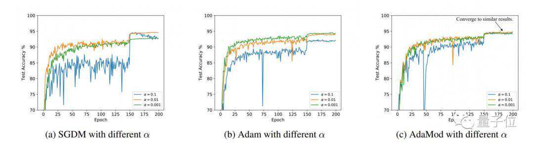 在上图中,我们可以看出,SGDM和Adam的训练结果都依赖于初始学习率的选择。而AdaMod即使学习率相差两个数量级,也能收敛到同一结果。