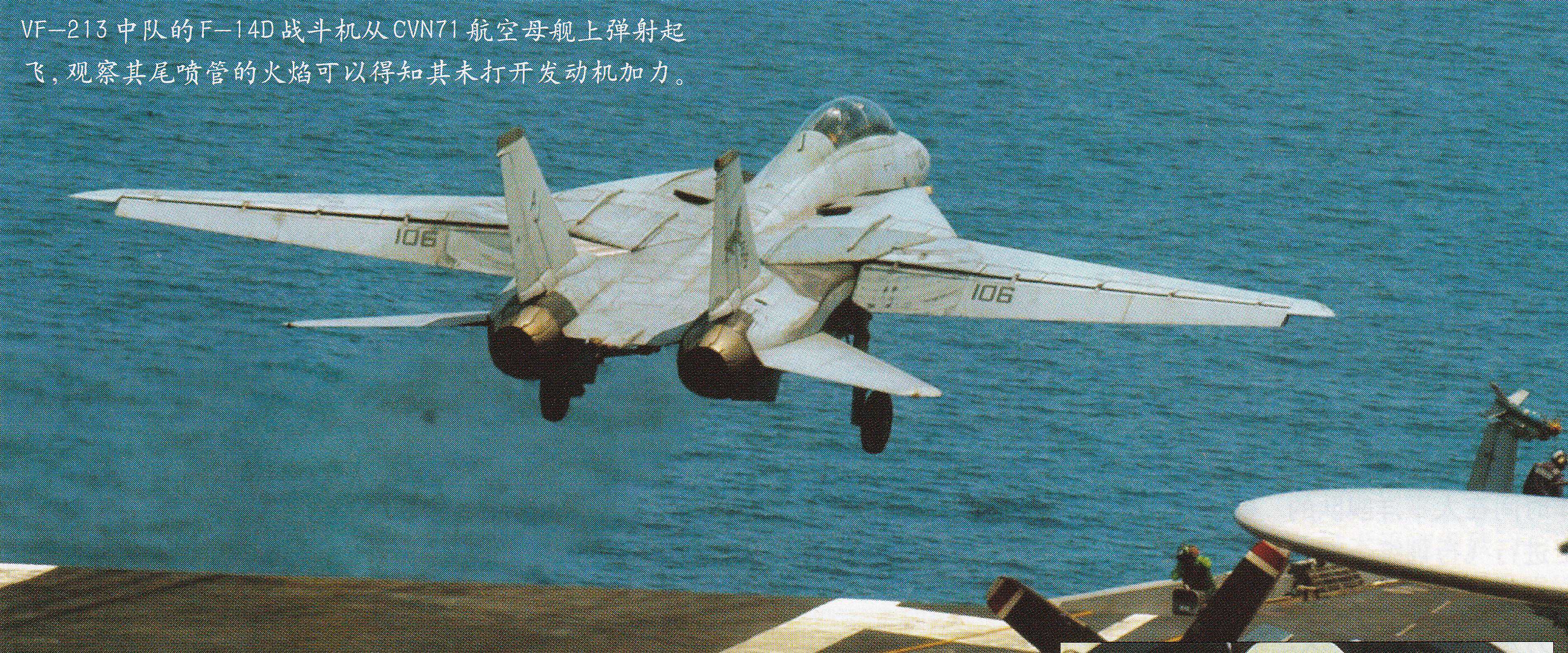 F110强劲的推力还能使F-14D在不开加力的情况下即可从航母上起飞,从而节省了大量燃油。相比之下,F-14A只有在无外挂或轻载状态下才能不开加力从航母上起飞。需要说明的是,不开加力起飞的主要原因可不是为了省油和显示推力强大,而是为了安全考虑。正因为F110推力太强,万一在弹射时一台发动机出了故障,飞机会因另一台发动机巨大的推力产生难以控制的偏航,轻则飞机损毁,重则人员伤亡。
