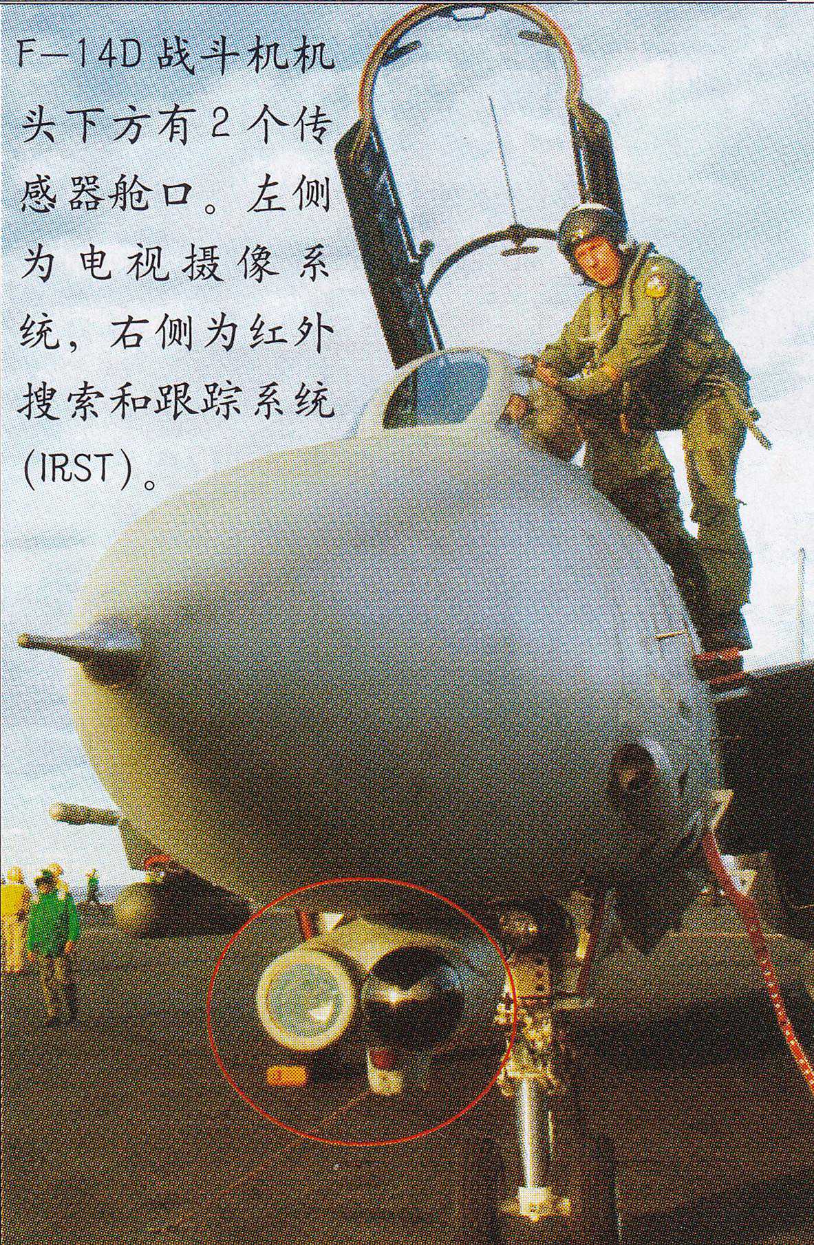 F-14D与F-14A在外观上的主要区别是F-14D的机头下方有2个传感器舱口。一个是同F-14A相同的电视摄像系统,另外一个是红外搜索和跟踪系统(IRST)。IRST是利用机体蒙皮和空气的摩擦热或飞机发动机尾喷口的高温热流来探测目标的,同时将目标热图像显示给飞行员。IRST使飞行员可以在很远的距离被动搜索和识别目标,减少了己方的暴露率,其最大探测距离可达185千米。TCS和IRST互相配合,再通过联合战术信息分配系统处理,使F-14D可以在雷达静默状态下同敌方交战,极大地增强了攻击的突然性,这对于在空战中赢得主动是极为重要的。