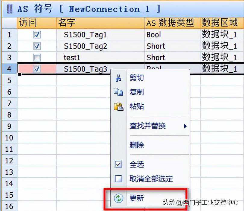 如果更改了PLC中的数据,可能会导致现有的WinCC变量或者AS消息不再与PLC中的数据相匹配。从起,可以通过更新按钮来保持数据的一致性。如下图所示,如果PLC中变量更改了数据类型,再次加载AS符号不一致的变量会显示红色标记。鼠标右键选择这一行或者整个表格,在弹出菜单中选择“更新”以保持数据的一致性。