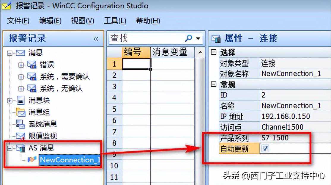 从版本起,来自S7-1500的消息如果更改,可自动应用于WinCC项目。启用这一功能需要勾选“报警记录”中连接级别的“自动更新”复选框。