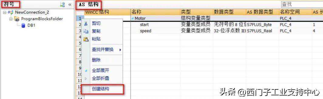 导入AS符号后,可以在列表中直接创建对应的结构。选择AS结构选项表,在对应的WinCC结构列中,用鼠标右键创建结构。