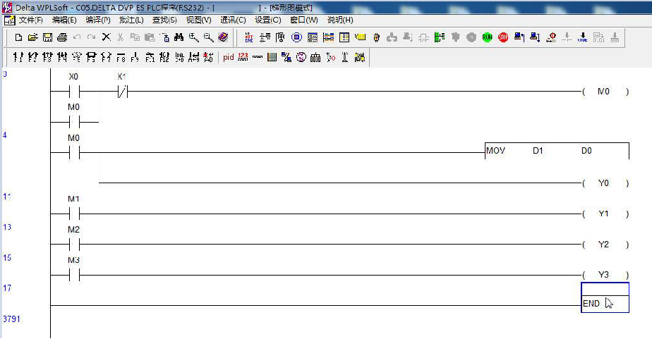 (1)新建简单PLC示例程序,建立外部输入点X0,X1,辅助继电器M0,外部输出点Y0,数据寄存器D0,D1。