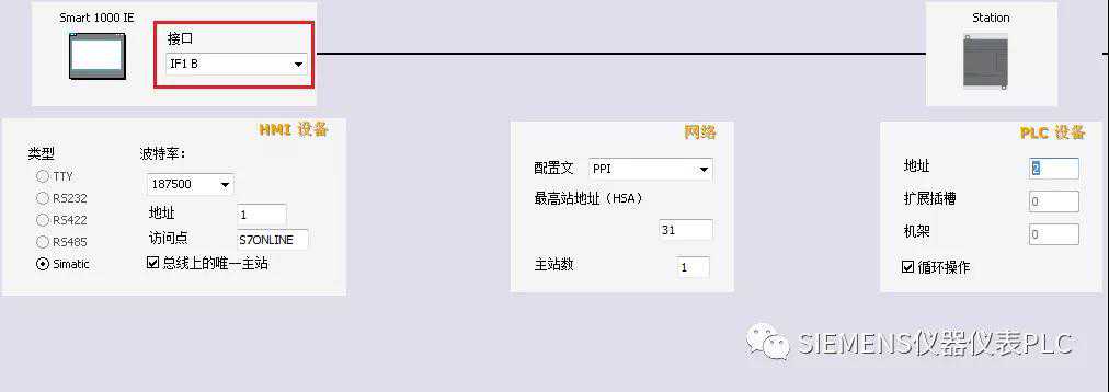 第四步:设置连接参数。首先选择Smart1000IE的接口为“IF1B”,即触摸屏的RS422/485物理接口。选中该接口后,该接口的参数设置窗口将在其下方自动显示。设置触摸屏的通信波特率为187500,站地址为1。
